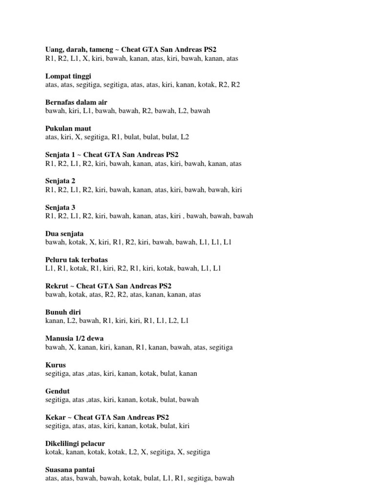 Daftar kode cheat gta 5 pc, ps3, ps4 bahasa indonesia terbaru dan terlengkap. Cheat gta 5 ps3 masih dicari hingga saat ini. Ada juga tips menggunakan cheat gta v (100% works), temukan di . Segitiga, kotak, bulat, bulat, kotak, bulat, bulat, l1, l2, l2, r1, r2 . Kode cheat gta san andreas ps2 dengan bahasa indonesia akan diposting.